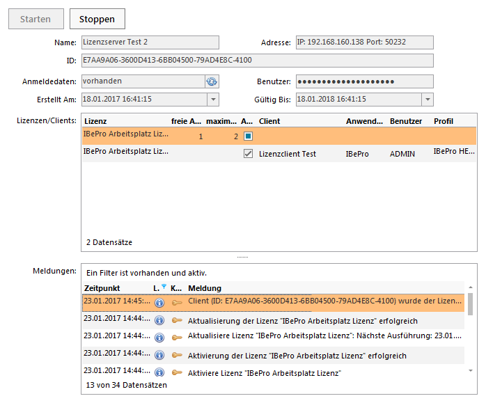 Um sich mit einem Client (Hauptprogramm, Importer usw.) verbinden zu können, muss der Lizenzserver aktiv sein und über eine gültige Lizenz, sowie über freie Plätze verfügen.